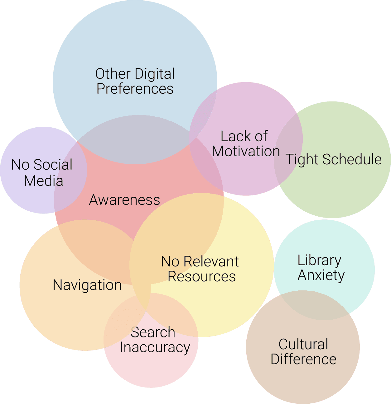 After analyzing how students use and avoid library resources, I mapped the challenges they face alongside the reasons they shared for not using them.