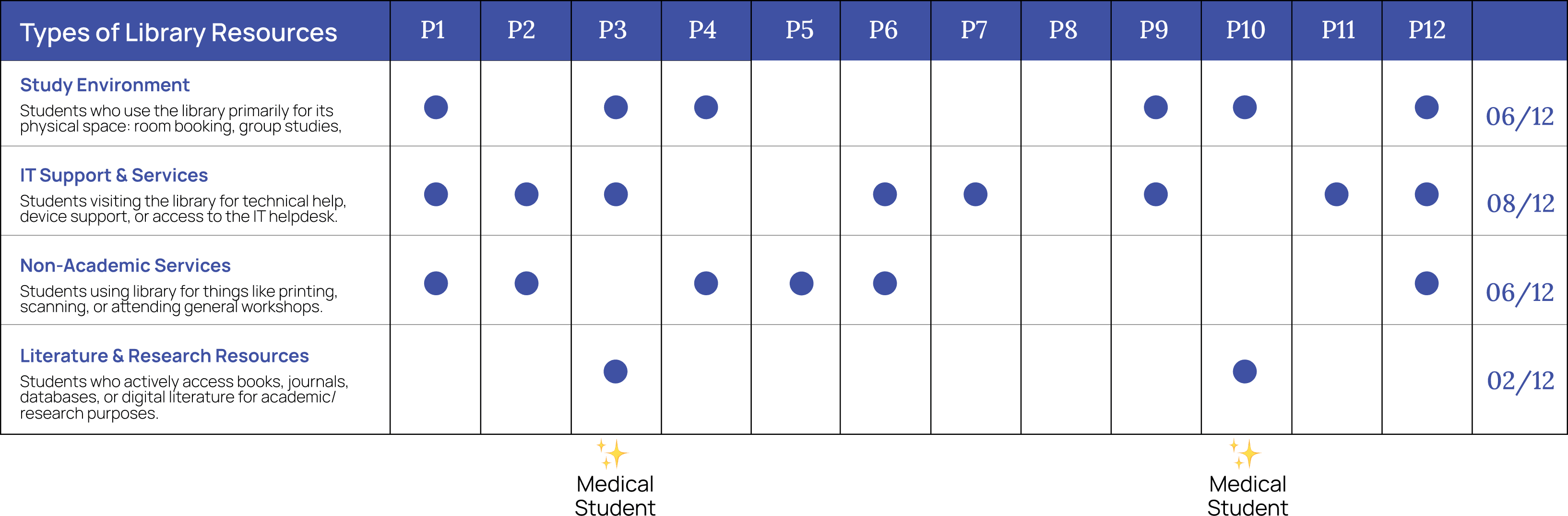 Only 2 out of 12 students actively used library literature resources for academic research, the core function libraries are designed for and both of these students belonged to Medical program. Most came for printing, group study, or IT support.